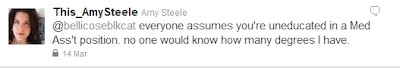 Amy cited privacy as the reason for her blog's deletion. However, she was more than willing to Tweet my article's address to people and continue to draw people's attention to writing containing her two months' worth of violations of another person's privacy. She was also willing to legitimize it by